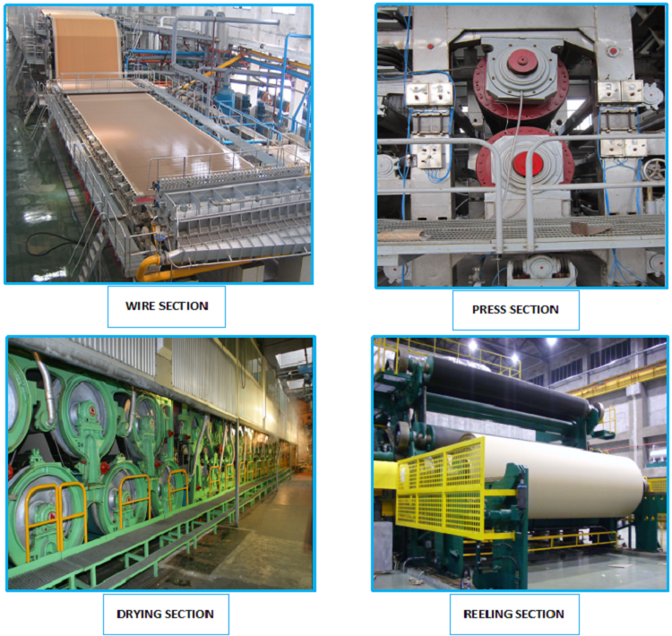 包括:施胶压榨、机内涂布、起皱装置、纵切机、真空系统、压力系统、润滑系统、引纸系统、蒸汽系统、抽风系统、传动系统、检测系统、控制系统等。